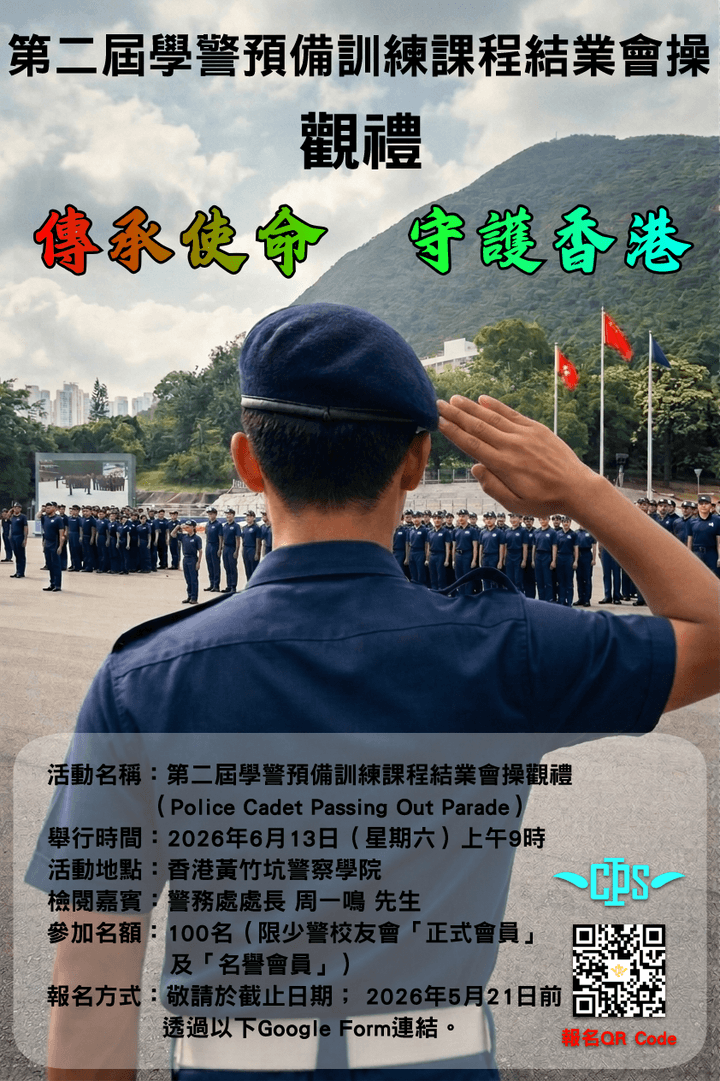 少警精神,薪火相傳。為延續警察少年訓練學校「智、勇、誠、毅」的校訓精神,並支持警隊優秀人才的培育工作,少警校友會榮獲警察學院邀請,誠邀各位會員撥冗出席,為新一代少警學員送上祝福與勉勵,共同傳揚服務社會、忠勇擔當的優良傳統。